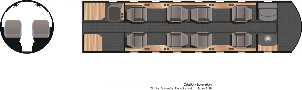 The Sovereign’s cabin is 25.3 feet long and can hold anywhere between eight and nine or more with most seats able to swivel 180 degrees. The interior is large enough that passengers can enjoy the 5.7 foot-high cabin. The baggage space available in the Sovereign is the largest of comparable private jets. The Sovereign has 135 cubic feet of total baggage space (100 cuft external; 35 internal); whereas the competing Hawker 800XP has only 48 and the Lear 60XR has only 54.